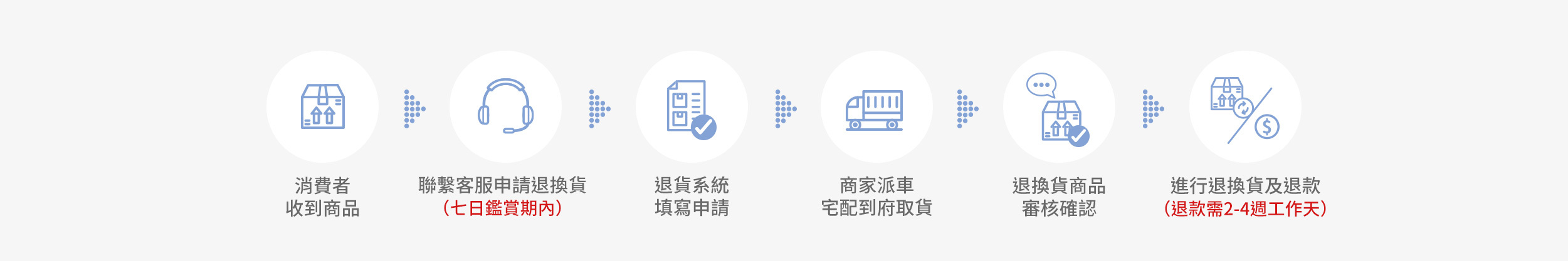換貨:聯繫客服→確認有庫存可提供換貨→準備完整發票、並完整包裝原商品→提供收件資訊→將由我端委託之物流進行來回件換貨。