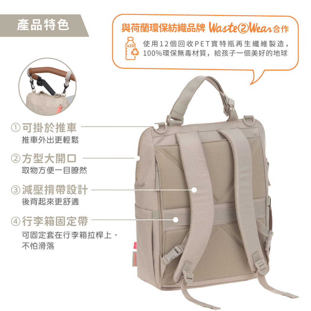 -附有育兒配件,尿布墊,小收納袋及防偷竊推車掛勾組;掛勾設計可將包包掛置於推車上。