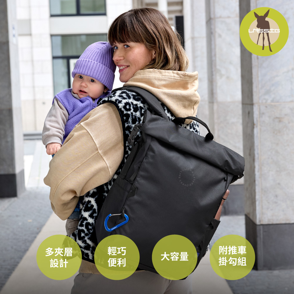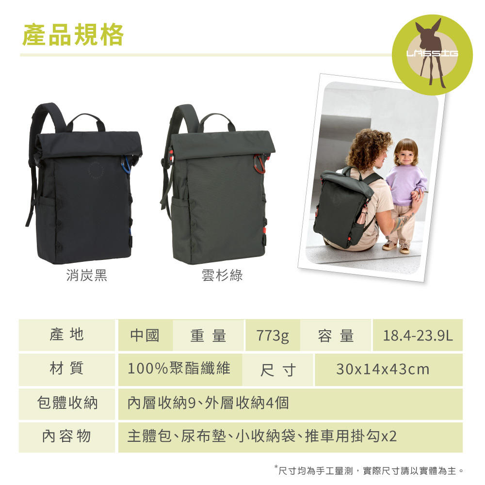 -外層防潑水材質,內外多夾層設計,方便分類放置育兒物品;內建鑰匙扣環,拿取最方便