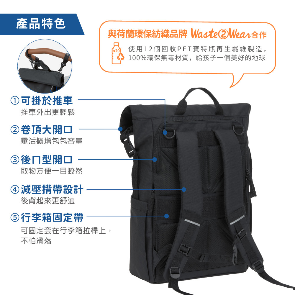-附有育兒配件,尿布墊,小收納袋及防偷竊推車掛勾組;掛勾設計可將包包掛置於推車上
