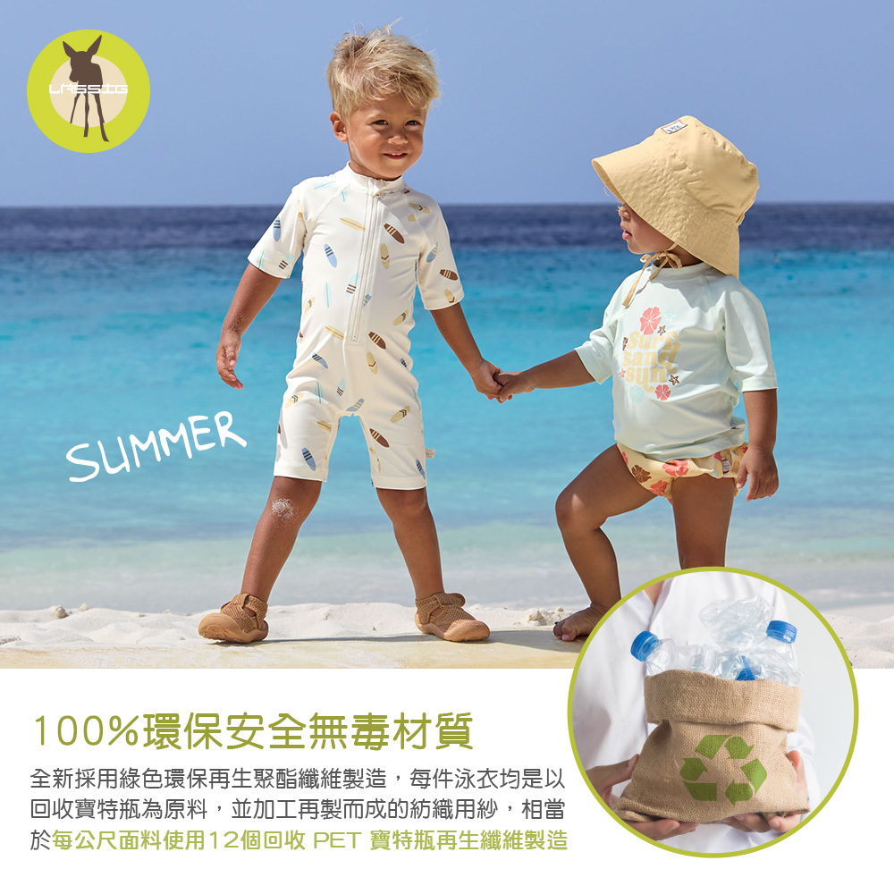 全新採用綠色環保再生聚酯纖維製造,100%安全無毒材質,給孩子一個美好的地球;每件泳衣均是以回收寶特瓶為原料,為經過寶特瓶清洗分類粉碎等步驟製成酯粒,並加工再製而成的紡織用紗;抗UV紫外線防曬系數UPF50+,可保護寶寶不受紫外線傷害;布料透氣快乾,以確保寶寶肌膚舒適;同時彈性絕佳,讓寶寶超好活動;扁平接縫車工,減少接縫處摩擦寶寶肌膚;LASSIG獨家開發,全新超強三層導流結構,防漏超強性,外層防水,內層吸濕透氣不回滲,不須再穿尿布;認證PETA純素認證標誌(PETA Approved Vegan),代表其紡織品生產中不使用動物成分,沒有任何動物在製造過程中受到傷害