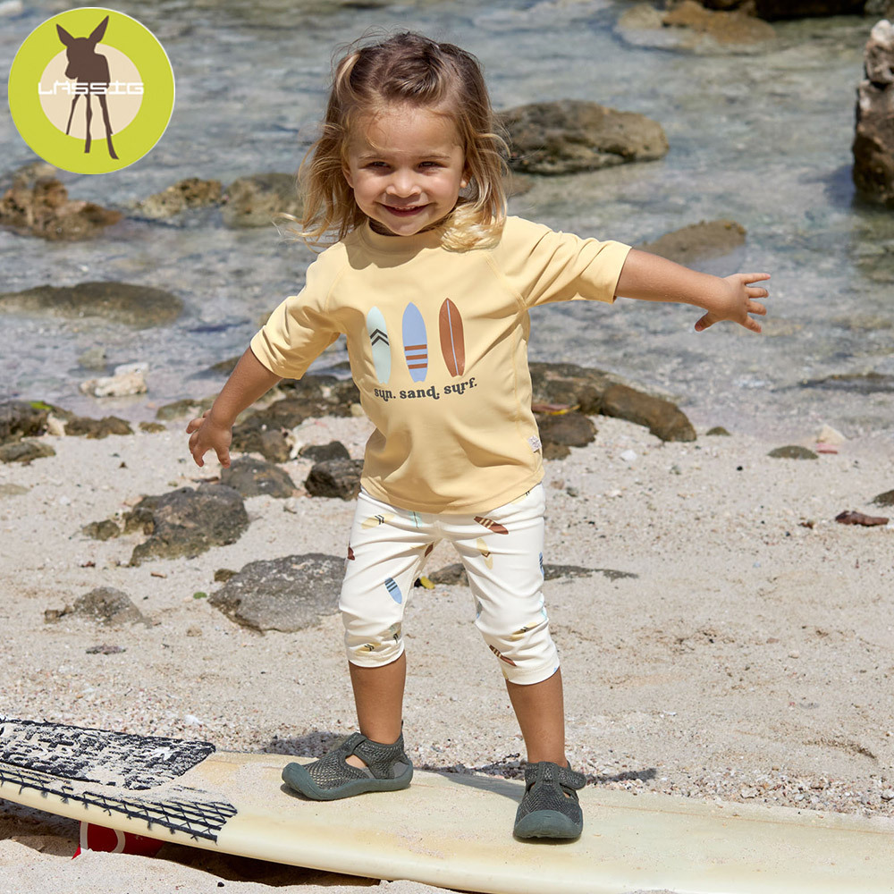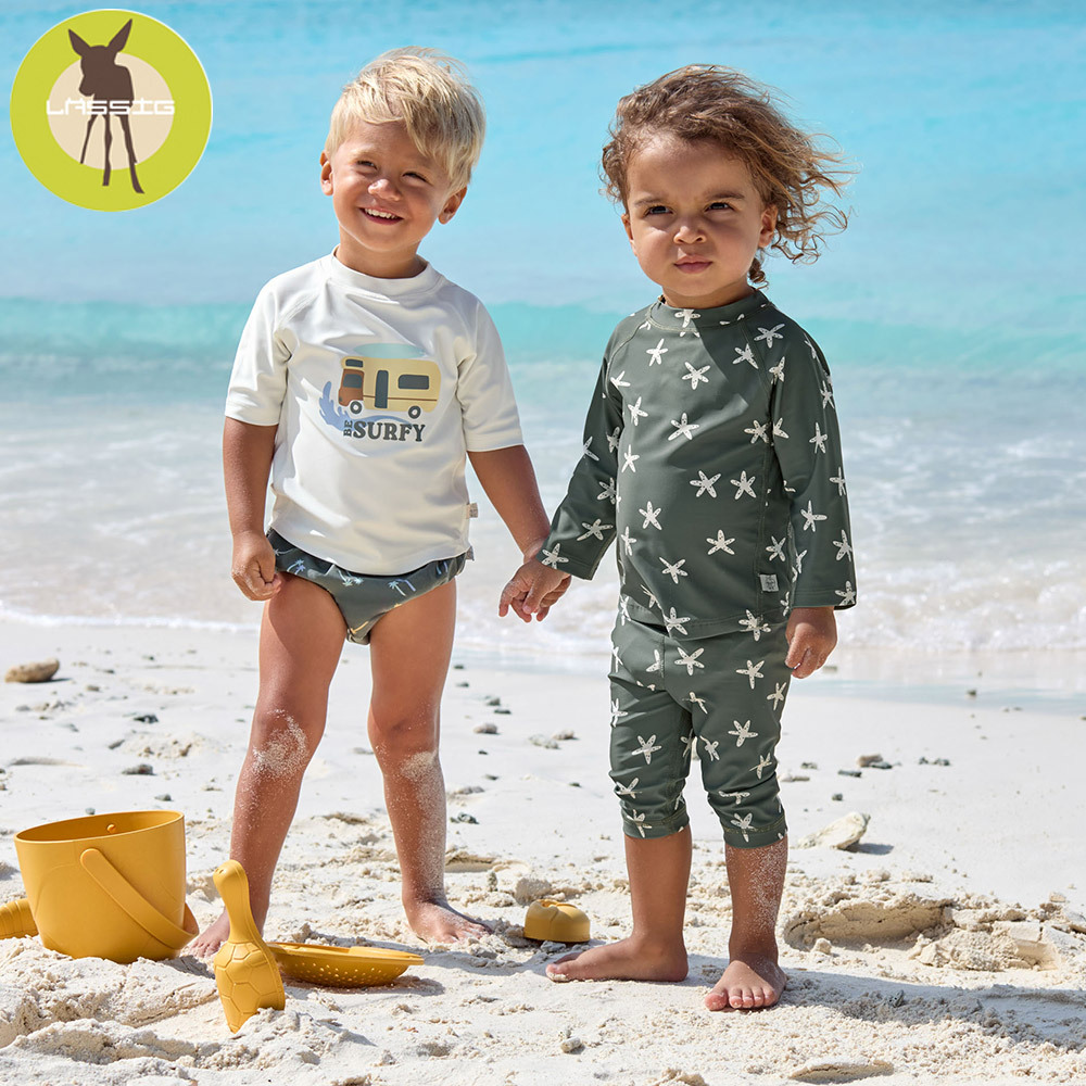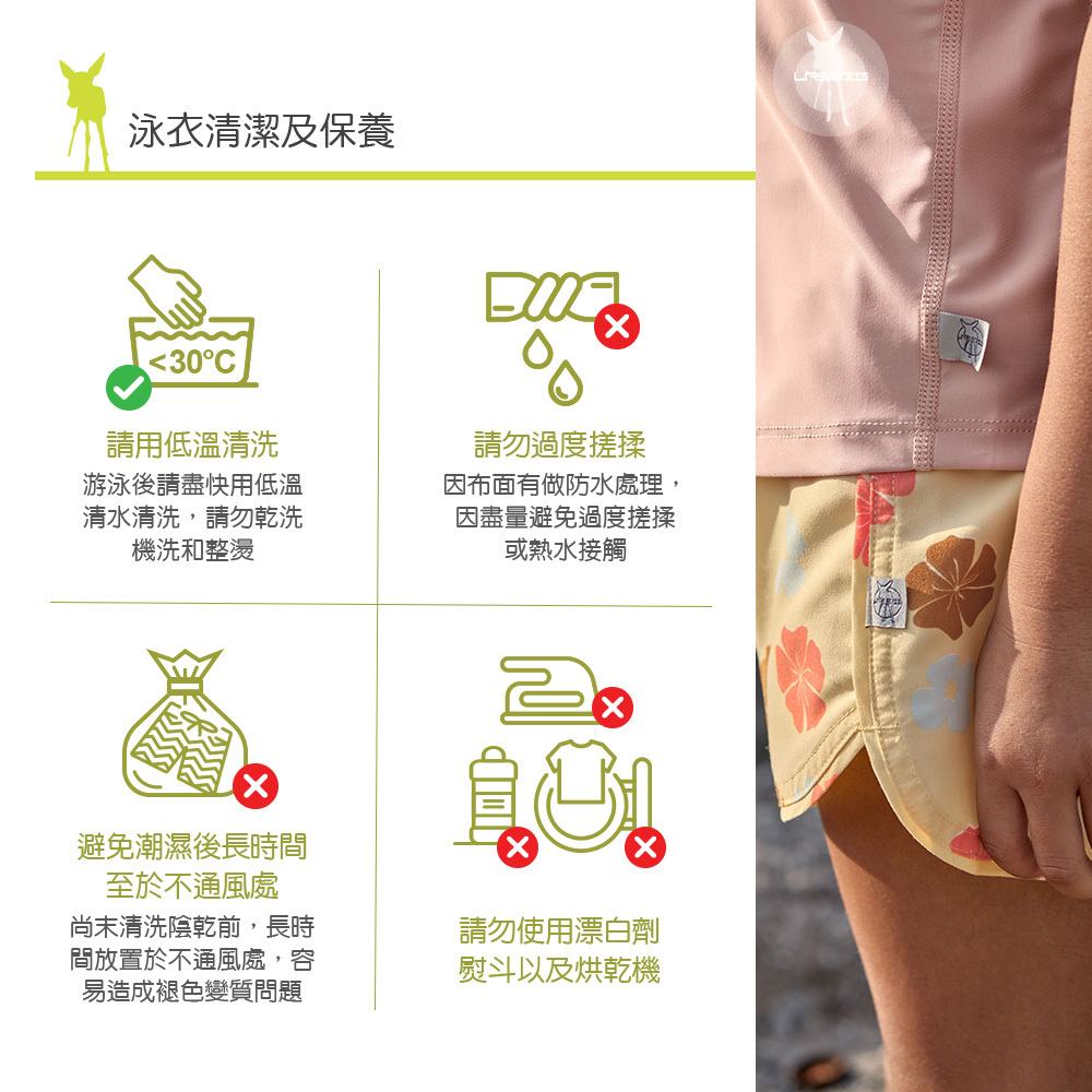 全新採用綠色環保再生聚酯纖維製造,100%安全無毒材質,給孩子一個美好的地球;每件泳衣均是以回收寶特瓶為原料,為經過寶特瓶清洗分類粉碎等步驟製成酯粒,並加工再製而成的紡織用紗;抗UV紫外線防曬系數UPF50+,可保護寶寶不受紫外線傷害;布料透氣快乾,以確保寶寶肌膚舒適;同時彈性絕佳,讓寶寶超好活動;扁平接縫車工,減少接縫處摩擦寶寶肌膚;LASSIG獨家開發,全新超強三層導流結構,防漏超強性,外層防水,內層吸濕透氣不回滲,不須再穿尿布;認證PETA純素認證標誌(PETA Approved Vegan),代表其紡織品生產中不使用動物成分,沒有任何動物在製造過程中受到傷害